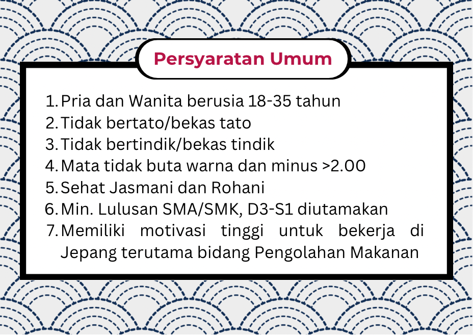 Terakoya Tokyo Japanese School merupakan sekolah yang dinaungi oleh IRIJJ (Indonesian Research Institute Japan-Jakarta) yang bergerak di Tokutei Ginou bidang Pengolahan Makanan.Dengan ini, kami ingin menjelaskan beberapa syarat dan ketentuan terkait dengan penempatan kerja di Jepang bagi siswa yang sudah pasti akan mendapatkan pekerjaannya (Selama siswa tersebut lolos seluruh proses seleksi) Syarat-syarat berikut harus dipenuhi: