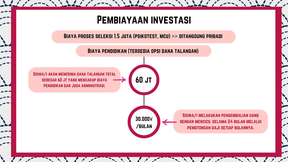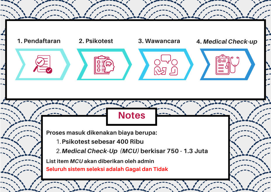 Informasi Tambahan Mengenai Dana Talangan“Min, pengen banget ikut tapi belum mampu secara finansial, gimana ya?”>> Dana Talangan Pendidikan yang kami sediakan adalah berupa talangan/pinjaman dari partner kerjasama kami yaitu BPRS Madina Syariah dalam bentuk yen atau setara total biaya pendidikan yaitu 60 juta rupiah yang nantinya akan mengcover biaya pendidikan sampai keberangkatan ke Jepang. Biaya dana talangan ini nantinya bisa dibayarkan saat kerja di Jepang!“Syarat untuk mendapatkan dana Talang tuh gimana ya?”>> Kamu bisa menggunakan opsi ini jika kamu sudah lolos semua tahapan seleksi dari BPRS Madina Syariah berupa verifikasi dan seluruh rangkaian seleksi dari Terakoya Tokyo serta resmi menjadi siswa/i Terakoya Tokyo Japanese School.”Pembayaran dana talangan ini kapan min?”>>Untuk pembayarannya Dana Talangan ini akan kamu bayar secara bertahap saat sudah di Jepang dengan dicicil setiap bulannya langsung dipotong dari gaji yaitu 30.000 yen selama 24 Bulan.“Ada persyaratan dokumennya ga min?”>>Ada kak, kami ada verifikasi administrasi dan wajib mengumpulkan dokumen-dokumen berikut mulai dari: