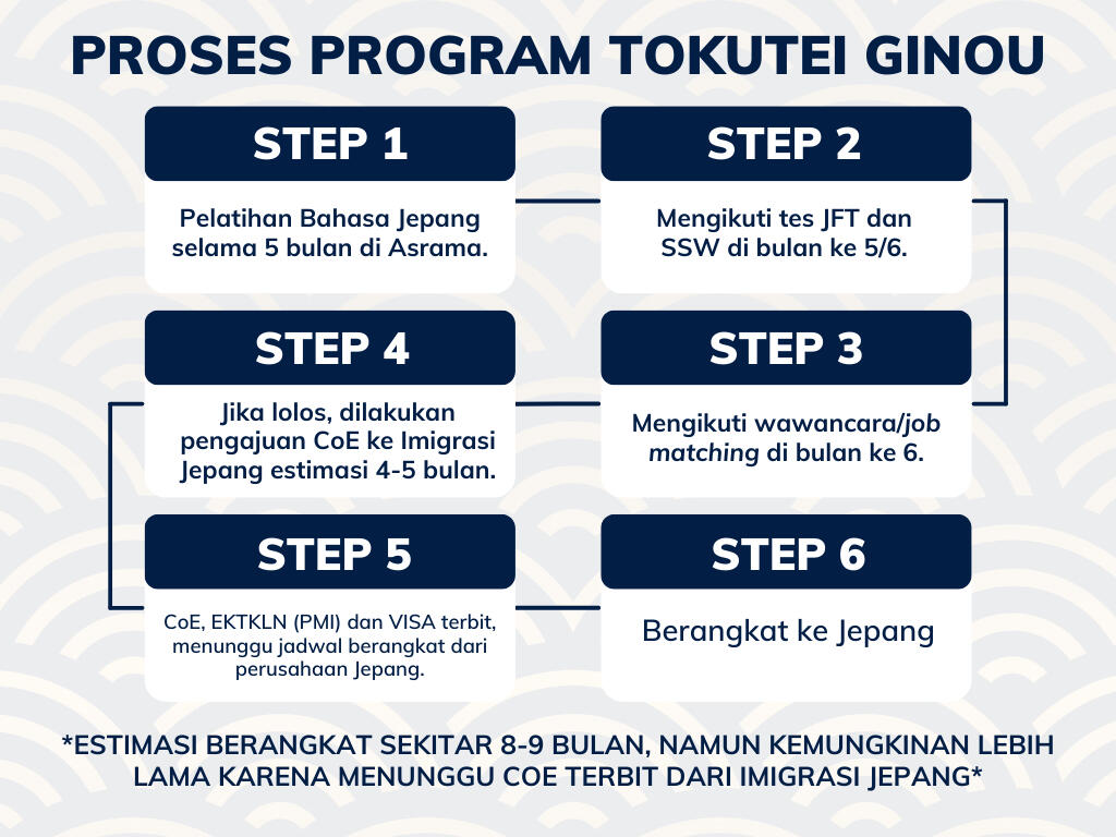 "Min Tera, emang perkiraan berangkatnya kapan sih?"Okee, berikut mintera jelasin alurnya dari awal sampai berangkat ke Jepang!1. Belajar, pendidikan dan pelatihan di Terakoya Tokyo selama 5 Bulan.2. Kamu akan ikut ujian JFT dan SSW di bulan ke 5/6 (Ada opsi di bulan ke 3/4 jika kamu memang sudah mahir dan bisa)3. Setelah 5 bulan pendidikan selesai, kamu akan diberikan waktu selama 2 minggu untuk tetap di asrama dan mengurus dokumen2 yang diperlukan untuk pengajuan CoE (Certificate of Eligibility) kamu ke Imigrasi Jepang. Proses ini nantinya akan dilaksanakan User Guidance bersama pihak perusahaan Jepang dan pengisian kontrak kerja ke Jepang.4. Setelah kamu selesai mengurus dokumen, kamu akan pulang ke domisili masing-masing. Proses pengajuan CoE ini tidak bisa kami prediksi cepat atau lamanya di Imigrasi Jepang. Yang jelas pengajuan CoE ini akan dibantu langsung oleh pihak perusahaan penerima kamu di Jepang, dan estimasi waktunya paling cepat 1-2 bulan, normalnya 3 bulan, paling lama 4 bulan dan bisa lebih lama lagi (Kami tidak bisa memprediksi berapa waktu pastinya karena memang tergantung load di Imigrasi Jepang). Selama menunggu CoE kamu turun, kamu akan tetap kami pantau terutama dari segi bahasa Jepangnya via Zoom dirumah.4. Setelah nantinya CoE kamu turun, kamu bisa untuk mengajukan pembuatan E-PMI dengan melampirkan CoE dan persyaratan lainnya di domisili masing-masing.5. Kamu akan diminta melampirkan CoE, E-PMI dan persyaratan lain untuk pembuatan VISA TG/SSW.Nah, kira-kira estimasi dari kamu masuk pendidikan sampai pemberangkatan itu bisa kita bilang 8-9 bulan, bahkan bisa lebih lama lagi kurang lebih 1 tahun.